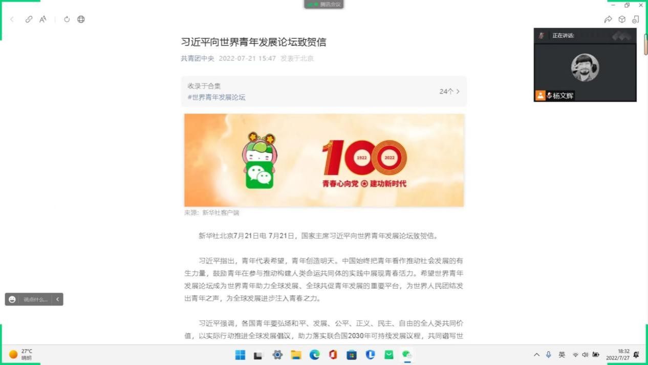 7月21日,国家主席习近平向世界青年发展论坛致贺信,迅速掀起青年学习致贺信精神的热潮。国际教育学院青年紧跟步伐,通过网络、电视等多形式学习总书记的致贺信,同时,国际教育学院各班长召开线上会议,带领班级全体青年进一步学习感悟。