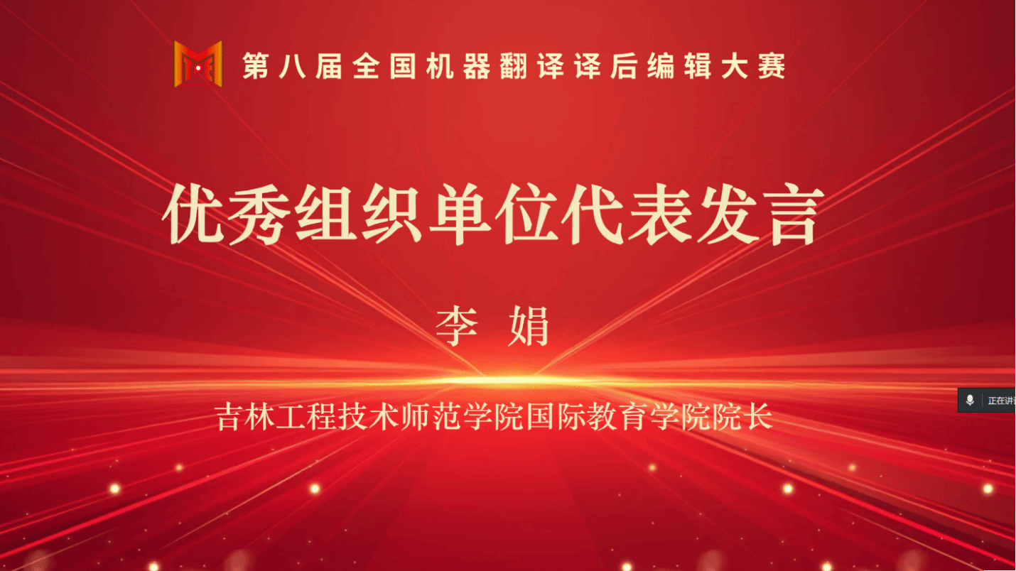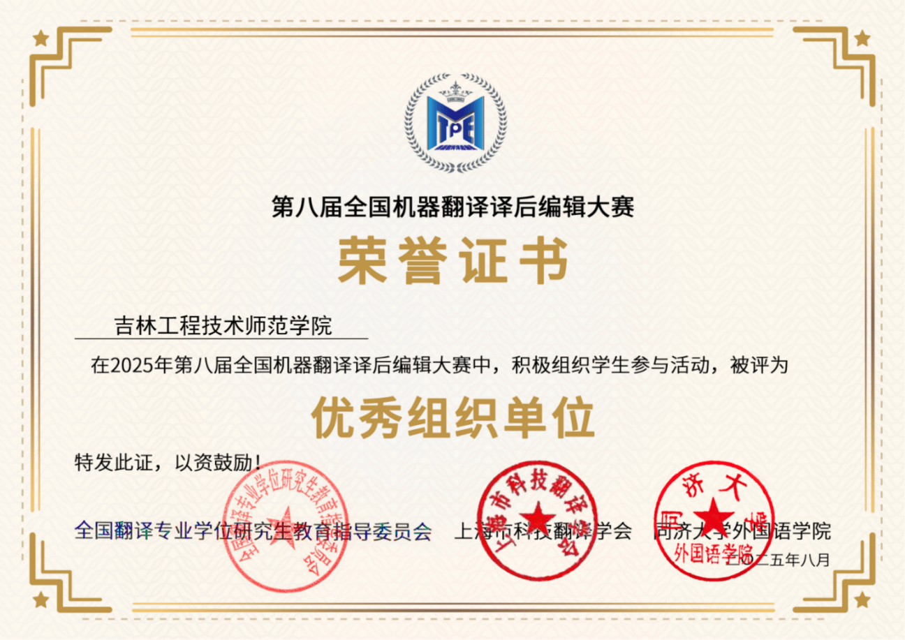 2025年7月,第八届全国机器翻译译后编辑大赛在线上成功举办。全国机器翻译译后编辑大赛是业内首个以机器翻译译后编辑为特色的专业赛事,已连续三年入选中国外文局"综合水平最高的30项国内翻译赛事"榜单。本届大赛由全国翻译专业学位研究生教育指导委员会指导,上海市科技翻译学会与同济大学外国语学院联合主办。在这场汇聚全球翻译人才的专业赛事中,国际教育学院凭借积极的组织态度与出色的统筹工作,成功斩获 “优秀组织奖”。学院院长李娟教授因在赛事组织过程中的突出贡献,获评 “优秀组织个人”,并受邀在颁奖典礼上作为高校代表发言。