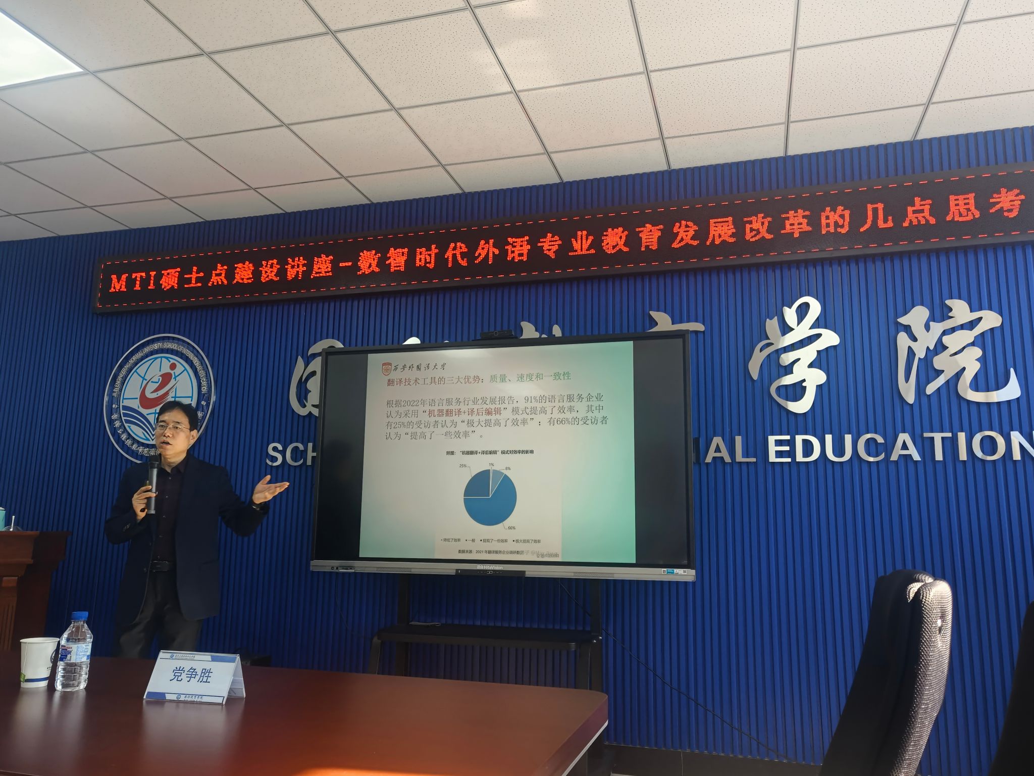 讲座由国际教育学院院长李娟教授主持。党争胜教授以"数智时代外语专业教育发展改革的战略思考"为题,深入剖析了新时代背景下外语教育的转型路径。他从英语专业创新发展与翻译专业建设两大维度,系统阐释了数智时代外语教育的改革方向。党校长特别强调,外语专业建设要牢牢把握"外"字特色,突出"变"字创新,强化"用"字实效,着力培养具有国际视野的高层次应用型人才。在翻译专业建设方面,他提出要重点打造"高层次、应用型、职业化"三位一体的人才培养体系,为讲好中国故事、传播中国声音提供人才支撑。