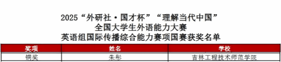 这份荣誉的背后,凝聚了朱彤同学的全力以赴和学院的精准培育。朱彤始终以高标准严格要求自己,扎实筑牢英语基础,注重中国文化及时事政治的学习与积累,不断提升用外语讲述中国故事的能力。国际教育学院也为朱彤的成长提供了坚实的平台和悉心的指导。学院始终秉持“立德树人”的根本任务,不断优化人才培养方案,将“理解当代中国”系列课程融入日常教学体系,为赛事积累了扎实的底蕴。