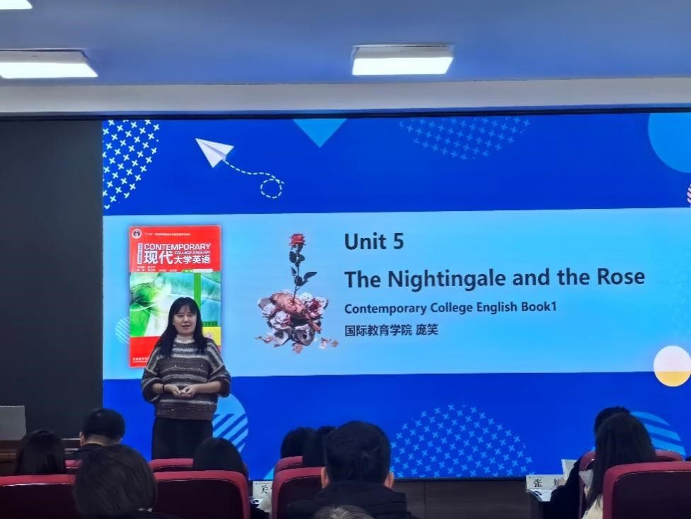 本次公开观摩课(赛)历时一个月,历经多轮激烈角逐。在最终的现场展示环节,庞笑老师选用《综合英语I》Unit5 The Nightingale and the Rose 这一课程中的相关内容,进行了说课与模拟教学。她巧妙地将课程思政元素融入英语教学,通过创设真实生动的跨文化交际场景,引导学生从“文化认知”走向“文化共情”,充分展现了以学生为中心、以能力为导向的教学理念。其流利地道的英语表达以及高效的课堂互动,赢得了现场评委和观摩教师的一致好评,充分彰显了我院教师的风采。